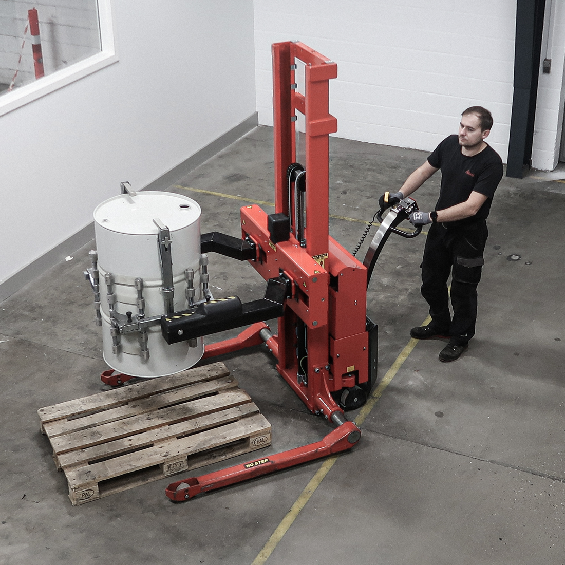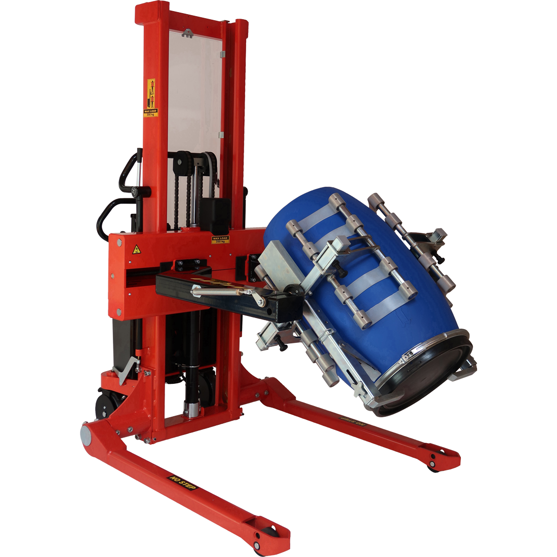 Rotation and opening/closing of the gripping arms, and the lifting and lowering function, are electric. The Multi drum turner can be fitted on both the fully powered Logiflex and the electric Logiflex. Both models are available with straddle legs, if the drum e.g. is placed on a closed pallet.